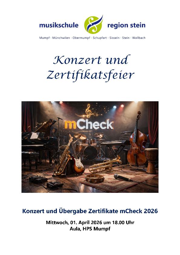 Zertifikatsfeier mCheck mit Konzert, Mittwoch, 1. April 2026, 18 Uhr, Aula HPS Mumpf– Es spielen Schülerinnen und Schüler aus der Klasse von Marita Binkert (Cello), Renate Sudhaus (Blockflöte) und Ilja Völlmy (Klavier)