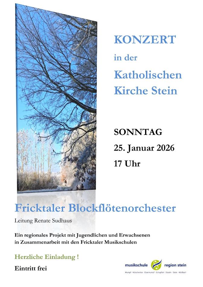 Sonntag, 25. Januar 2026, 17 Uhr: Konzert mit dem Fricktaler Blockflötenorchester, Ltg. Renate Sudhaus, Kath. Kirche Stein/AG