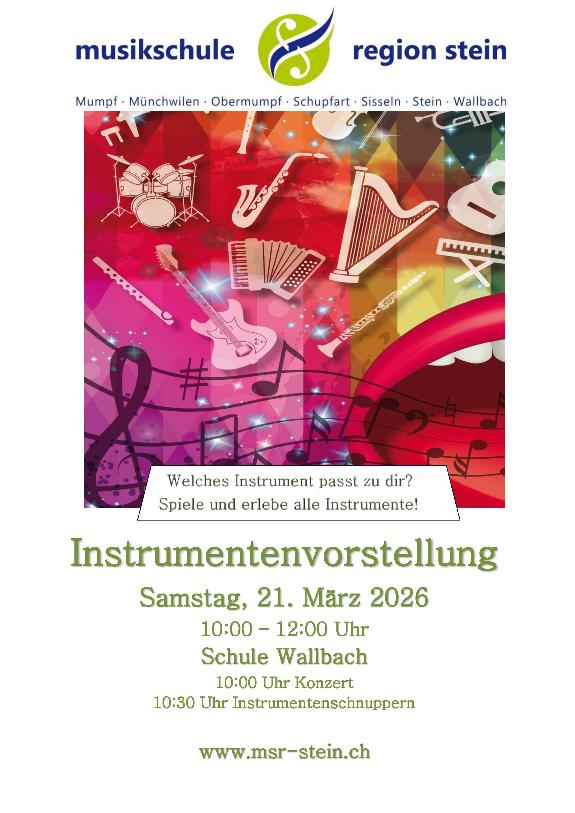 Samstag, 21. März 2026, 10-12 Uhr: Instrumentenvorstellung, Schule Wallbach (Flyer siehe unten)